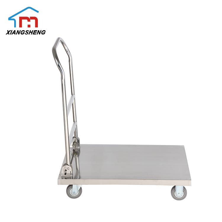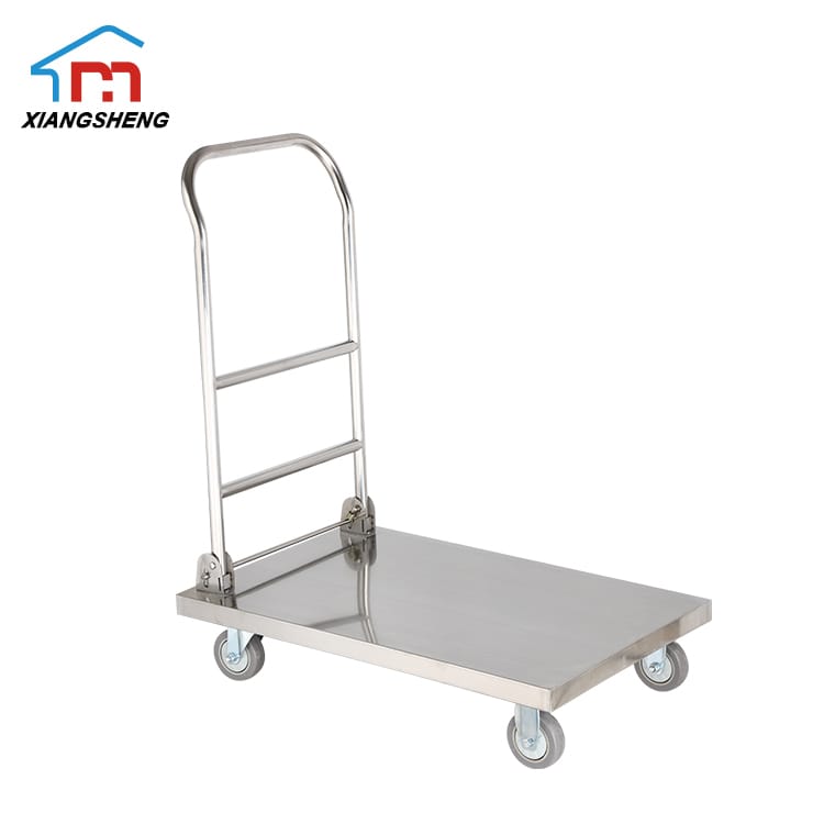 Fábrica fornece diretamente carrinho de plataforma de aço inoxidável. Este carrinho é feito de aço inoxidável de calibre pesado (1,0, 1,2 mm de espessura), é capaz de transportar suavemente até 300 kg.
